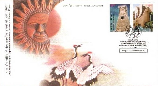 The stamps released to commemorate 30 Years of Diplomatic relations between India and Korea.These satamps depicts Astrological observatories: “Cheomseongdae” in Kyong-ju, South Korea, built during the 7th century AD and “Jantar Mantar”of Jaipur, India, built in 1727.Issue Date: 10 December 2003