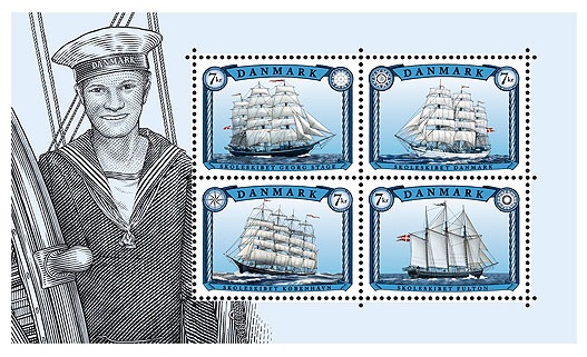 The four stamps depict the training ship KØBENHAVN, which disappeared in 1928, the two current training ships DANMARK and GEORG STAGE, while the last stamp depicts FULTON, which is primarily used for school trips for primary and lower secondary school pupils, continuation school etc.